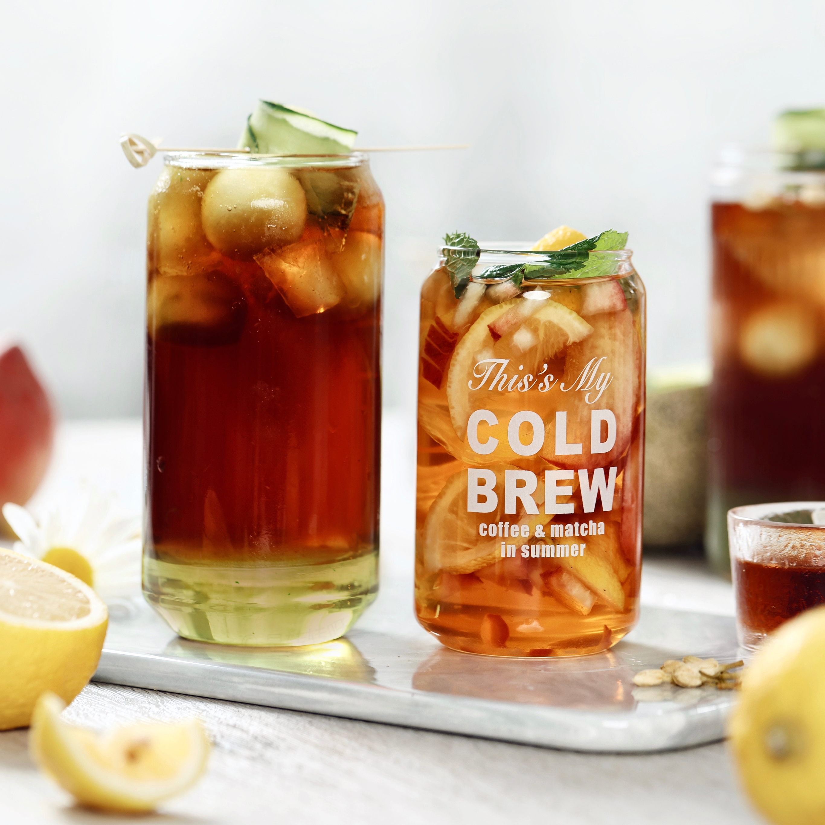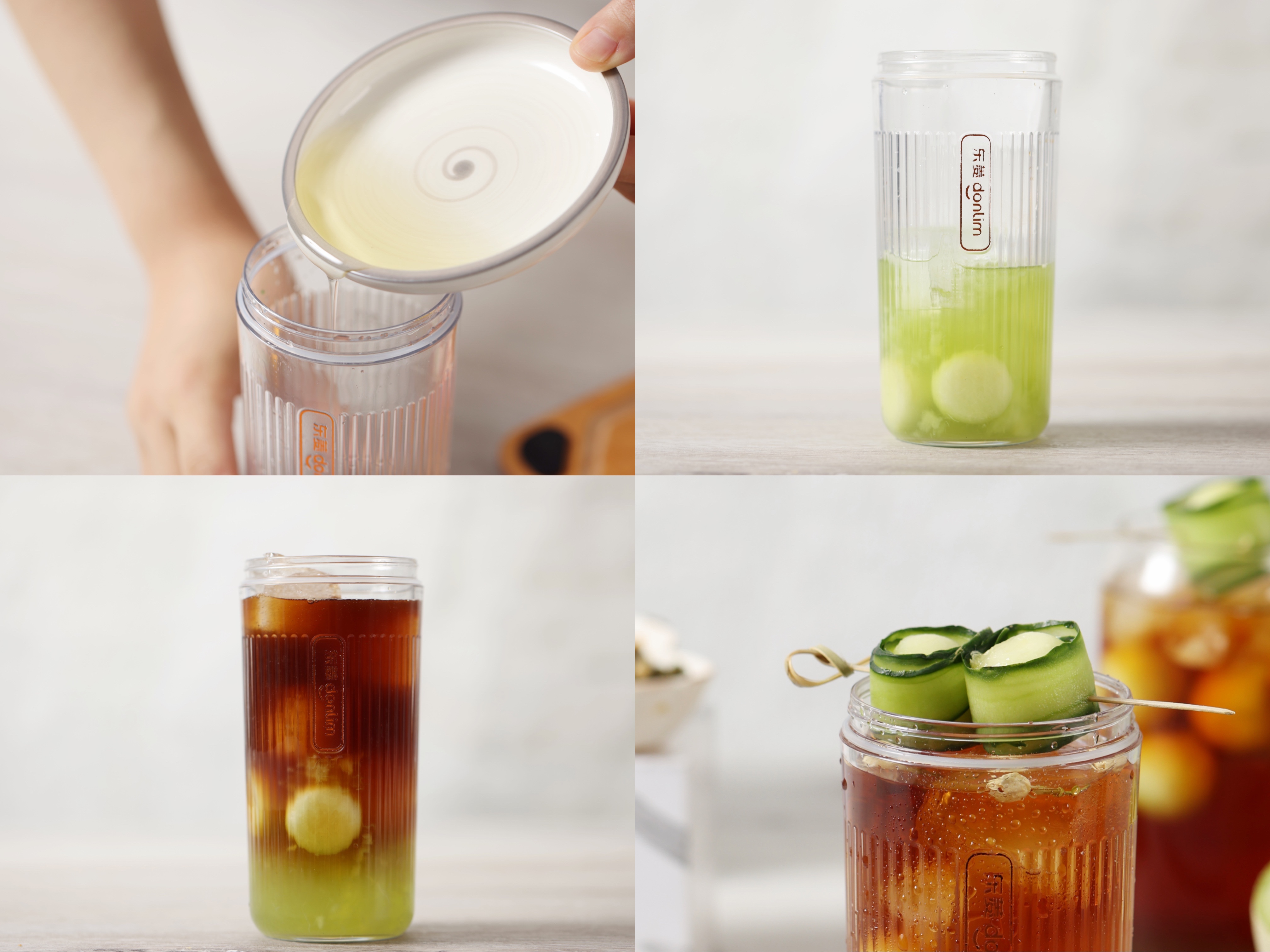 6.倒入糖浆,装入一些蜜瓜球,再放上冰块,最后倒入萃取好的咖啡液就完成啦!顶部我还做了一颗黄瓜蜜瓜串,用黄瓜包上蜜瓜球,卷起来,再用钳子就完成啦!