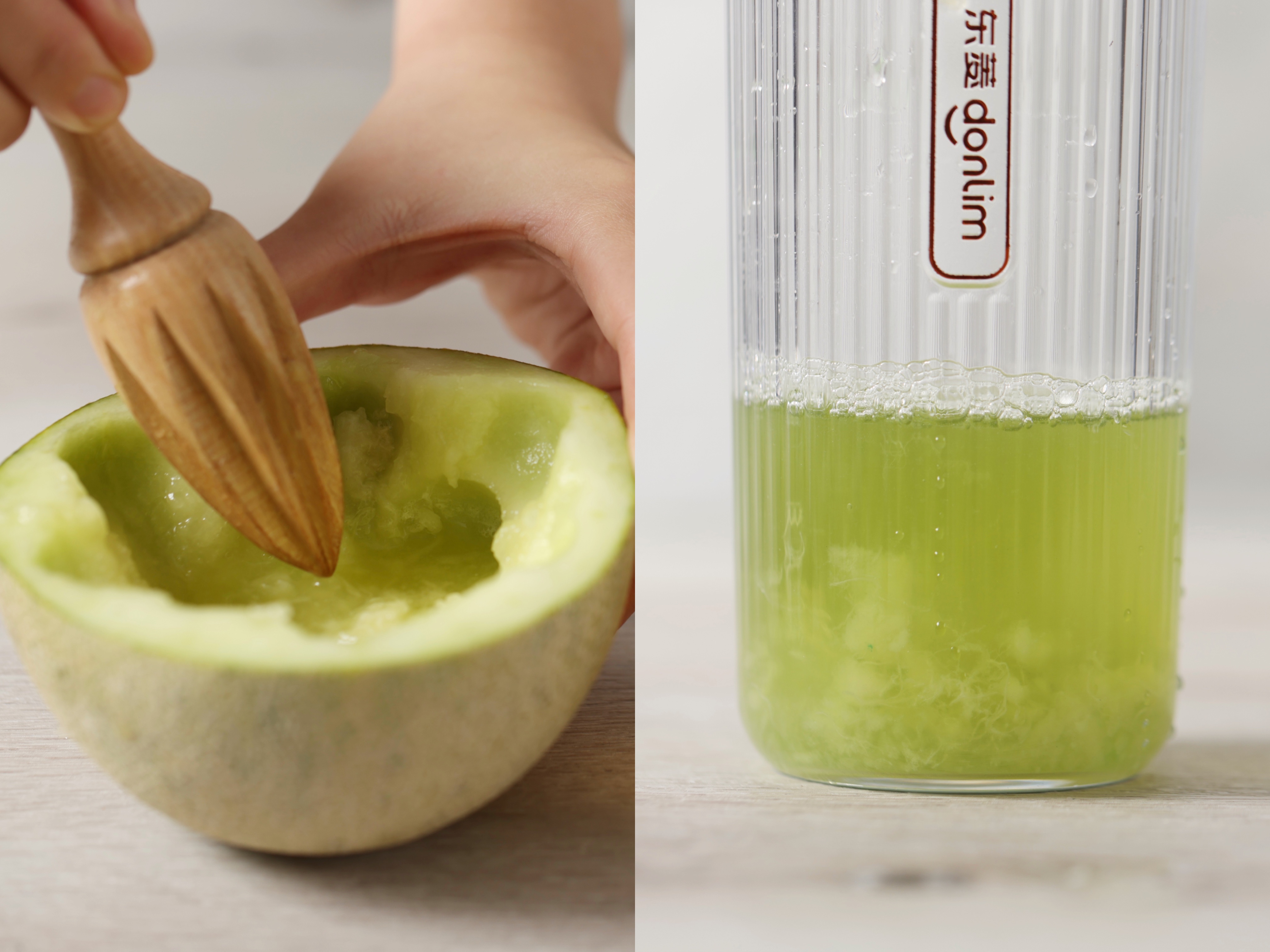 4.蜜瓜压出汁水,再混合茶水、倒入杯底。