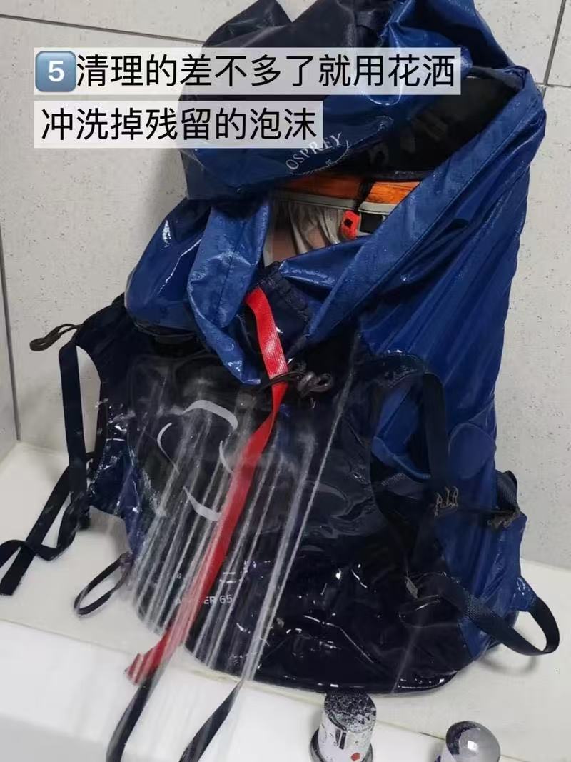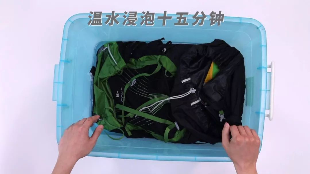 根据背包大小,选择合适容器进行浸泡,或使用花洒对整包进行冲刷浸湿,去除绝大部分表面灰尘。