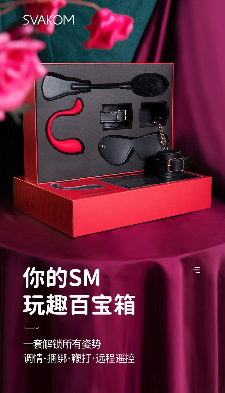 这个套装是司沃康的产品,已经是我们熟知的品牌了,质量和安全性是一定有保障的。套装里的产品除了基本的调教用具:手铐,眼罩,调教拍之外,还有一个有很多种用法的跳蛋。尤其是其中一个功能,让我觉得特别期待,相信大家会喜欢。手铐是皮质的,内层有短绒毛,这样束缚住手的时候,不管束缚再紧,或者挣扎起来也不会弄痛,比起纯金属的手铐,和一些软皮手铐都好很多。手铐有六孔,可以调节大小,不管手腕大小,都能调到合适的位置。跟手铐是同样的材质,外层是皮质的,内层的短绒毛也很舒服,跟一般的情趣眼罩相比,这个眼罩要大很多,也厚很多。我之前戴别的眼罩,总会动着动着往下掉,然后要停下来调整眼罩,十分扫兴。这个眼罩我戴上之后剧烈运动也不会掉,而且不会勒得很不舒服。因为眼罩大大的,还显得脸很小,如果还有外貌焦虑,或者担心表情管理不好(虽然我们提倡自信做自己),戴上这个眼罩就完全看不见表情了,嘴唇微张,还很性感。这个调教拍是双头使用的,一头是蓬松的细羽毛,rua起来十分舒服。一头是皮质的板子,跟手铐和眼罩相比,它的皮质偏软,加上板子比较宽大,所以打起来不会很痛,但也要注意掌握好力道。这个跳蛋是套装里最贵的东西。U型的硅胶绳,连接着一大一小两个跳蛋,大的可以入体,同时小的可以刺激豆豆。也可以直接用大的刺激豆豆。震感十分绵密,也不会过于刺激,我倾向于用来做前xi,等嗨过几次之后,会更容易在之后跟伴侣互动时到达顶峰。粉色和红色两种颜色可选,粉色可爱,红色魅惑,都是颜值很高的颜色!(不过礼盒里的都是红色哦,没有粉色可选!)而且它还能通过手机连接,在手机上控制,自己玩,可以解放双手。两个人玩,把控制权交给伴侣,随意切换,也是十分不错的玩法。而且这个跳蛋还有一个我觉得非常不错的模式,它会随着当前环境的声音分贝的大小而调整震感。比如说音乐声,想想就,有点期待它震感变强的时候。还有异地恋的时候,它也可以远程在手机上操控,即使是异地恋,也要保持情趣呀。最后再给大家介绍下我们的老朋友——SVAKOM司沃康