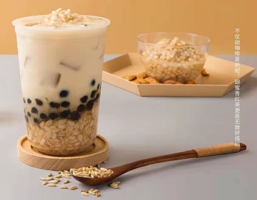 步骤:出品杯中依次加入黑糖珍珠、燕麦罐头、冰块、燕麦奶、蜜香红茶即可。