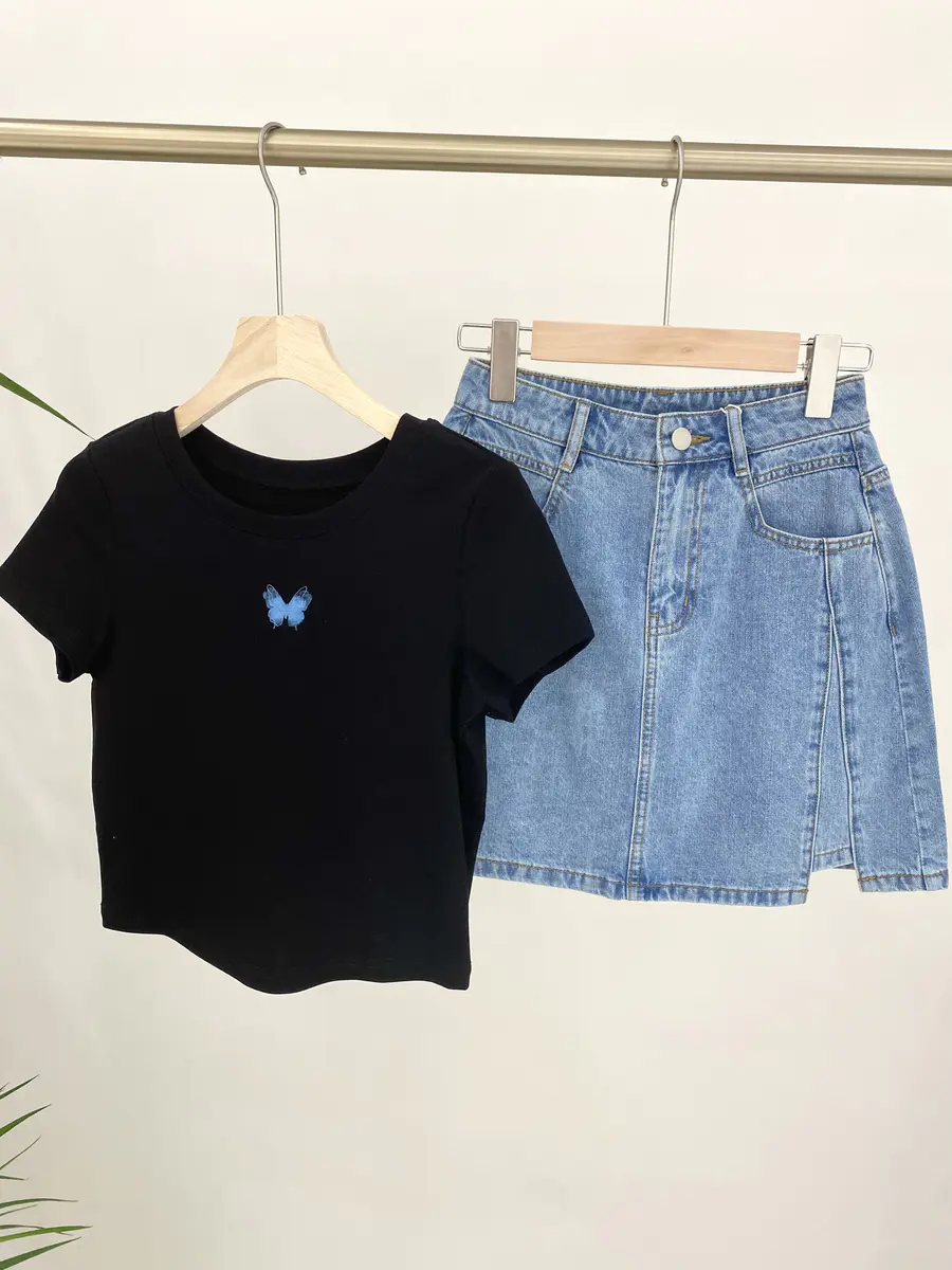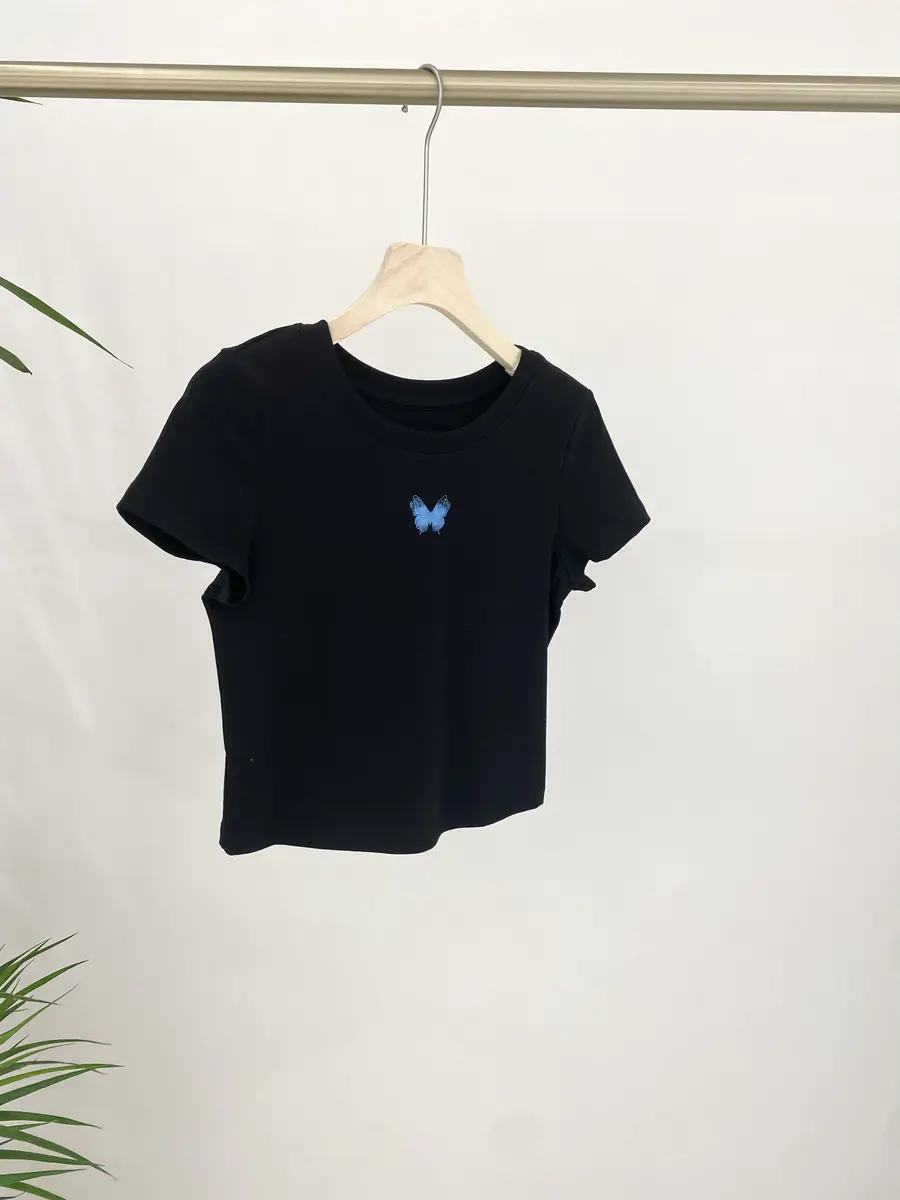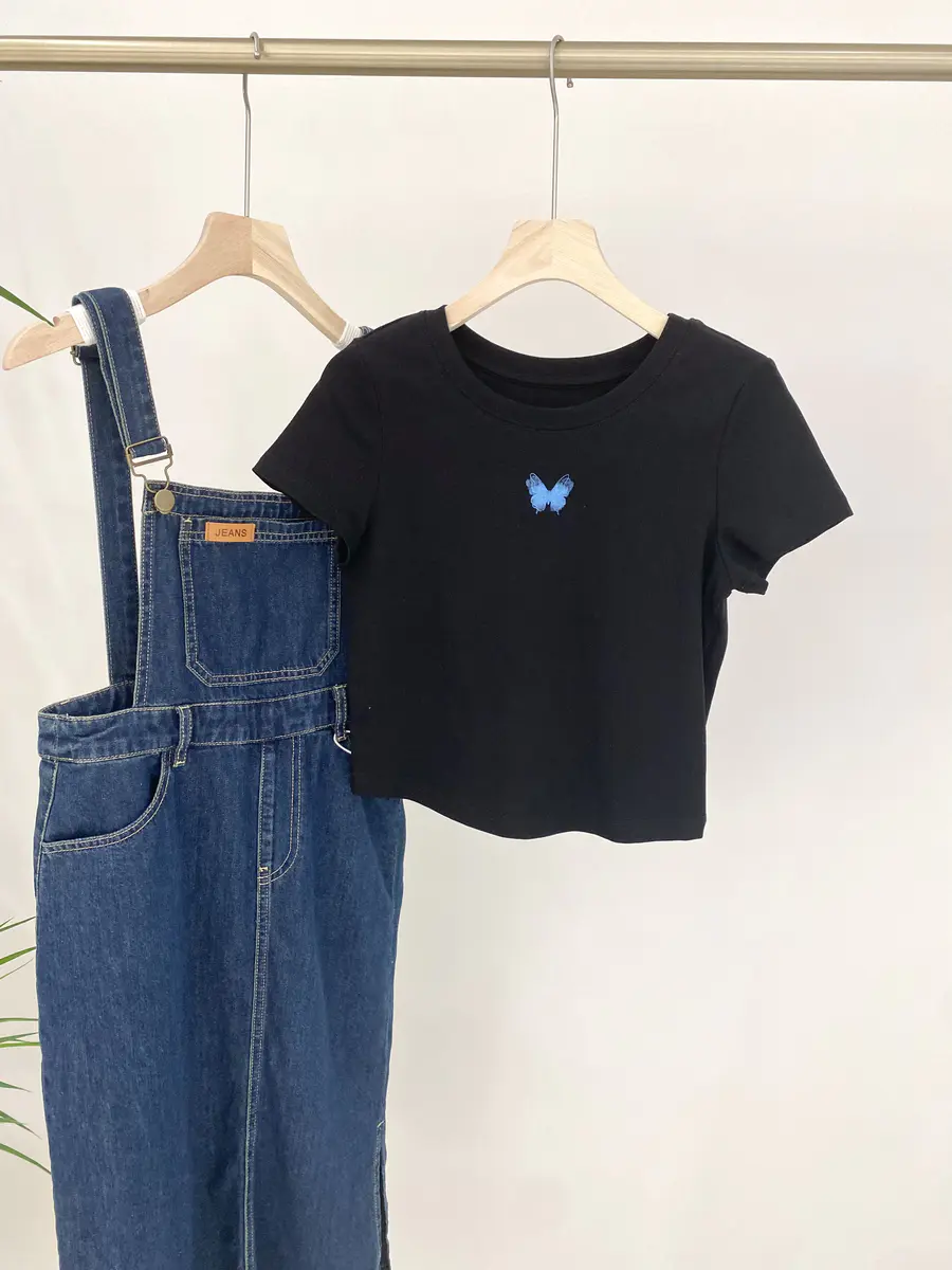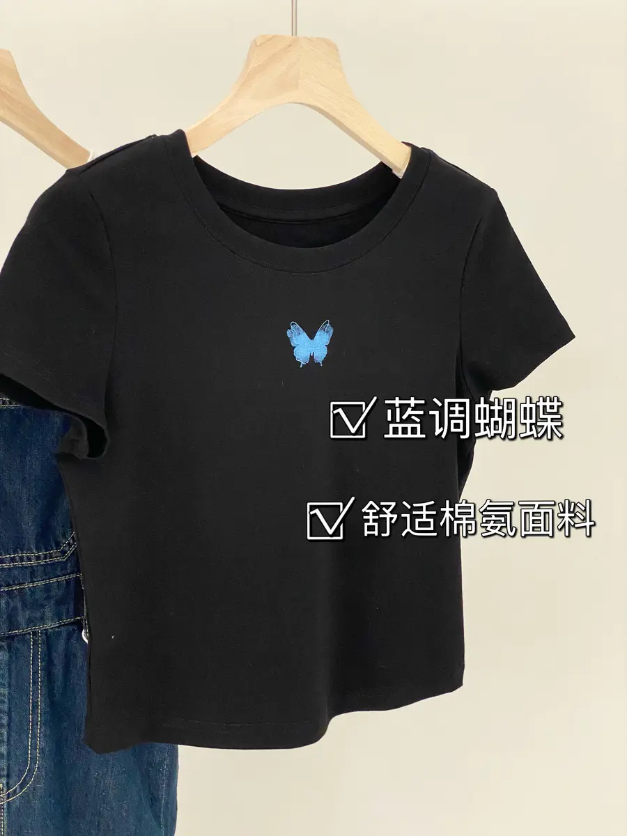 很别致的印花t,简单的蓝调蝴蝶元素,成为了点睛之笔,T恤本身属于截短修身版型,所以上身其实是非常显瘦和显身材的