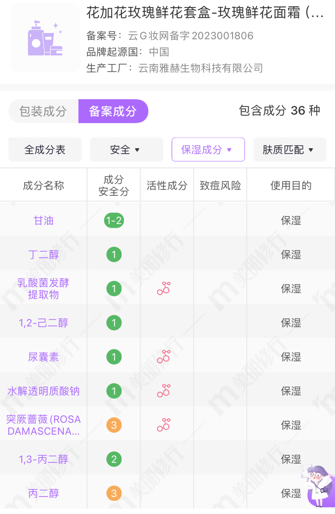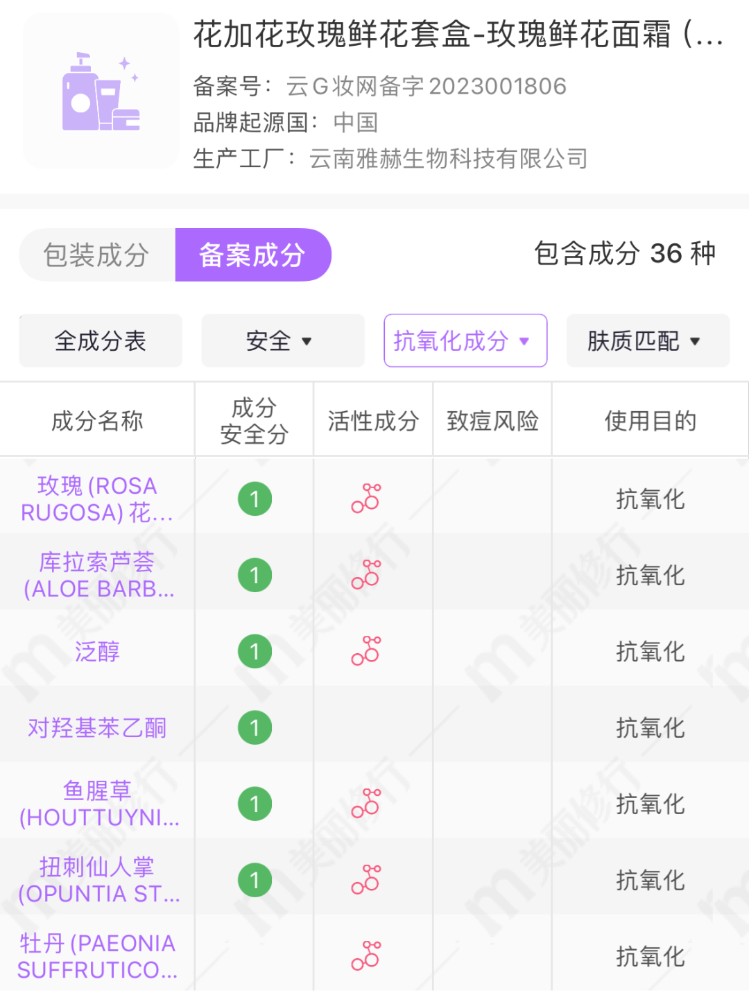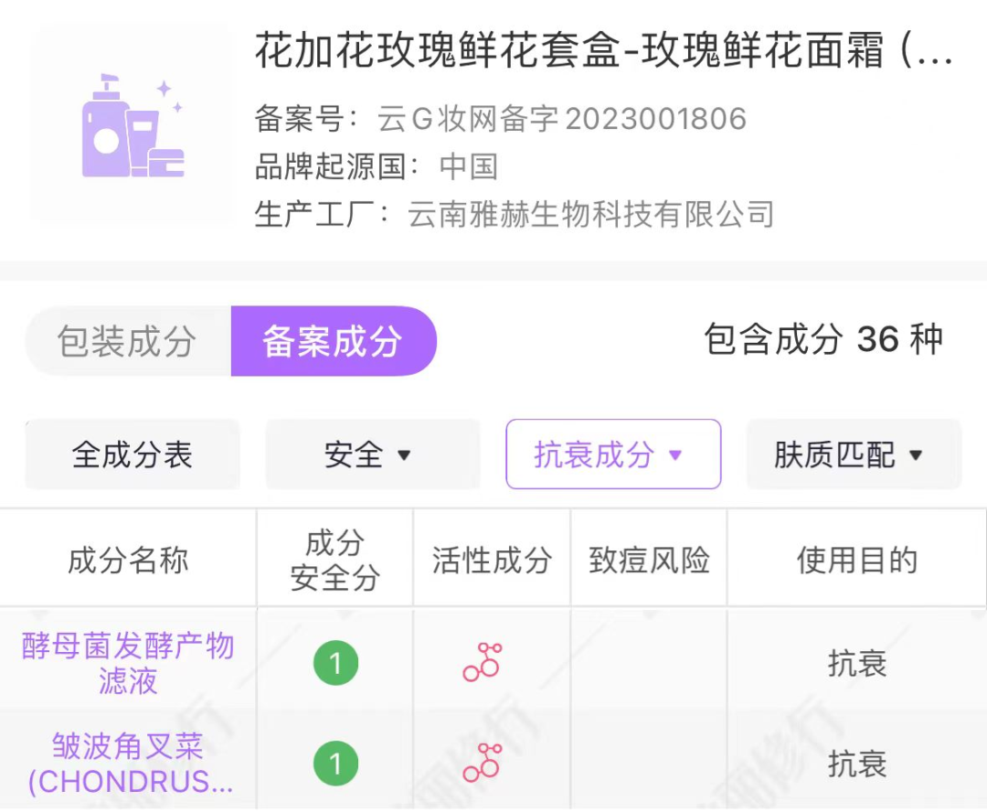除了玫瑰花提取物,还添加了库拉索芦荟、泛醇、酵母菌发酵产物滤液、鱼腥草、扭刺仙人掌、牡丹等。