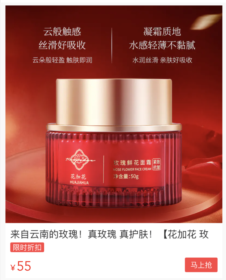 品牌来自盛产墨红玫瑰的云南,因地制宜地把当地可以喝的墨红玫瑰提取精华,转变成用来护肤的玫瑰面霜,纯植物提取,非常温和安全。