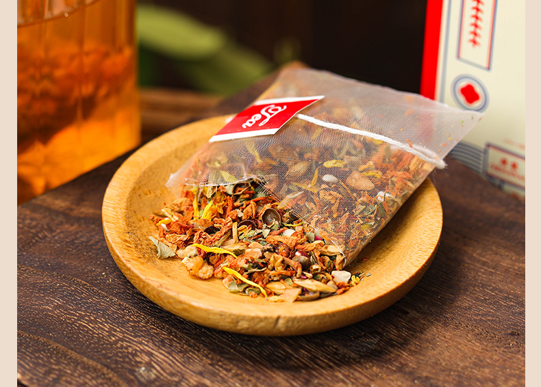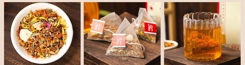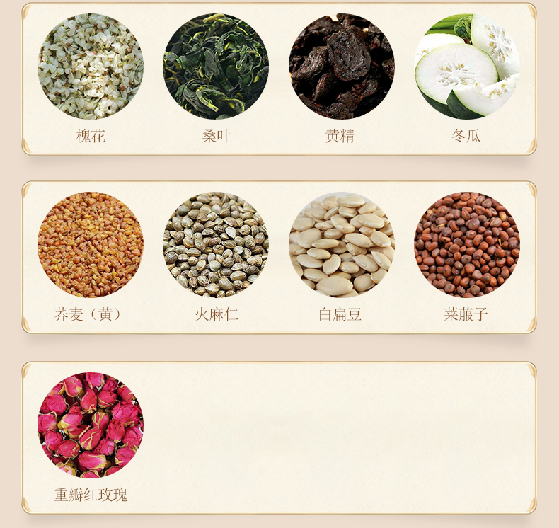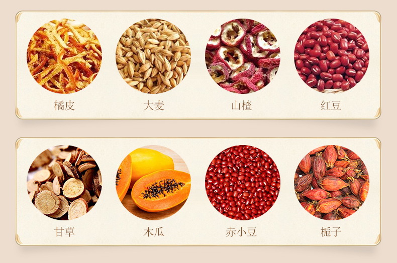 橘皮、大麦、山楂、红豆、甘草、木瓜、赤小豆、栀子、蒲公英、罗汉果、柠檬、荷叶、金银花、茉莉花、薏米仁、决明子、枸杞、红枣、淡叶花、菊花、槐花、桑叶、黄精、冬瓜、荞麦、火麻仁、白扁豆、莱菔子、红玫瑰