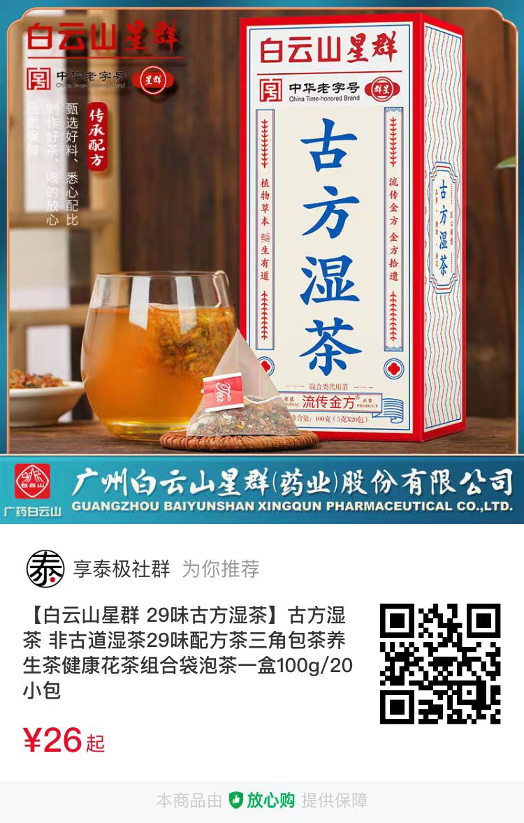 除此之外还配了20多种食材,白云山运湿,精工细作。冲泡汤色透亮,醇香四溢,抿一口回味无穷~每天喝上一杯,方便省事,无湿一身轻!