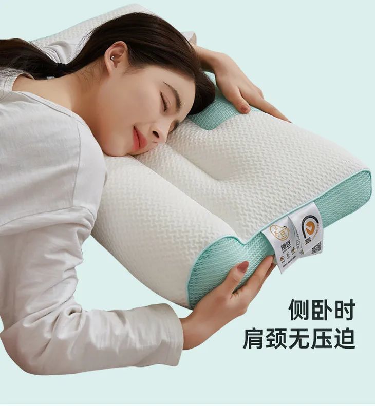 整个枕头中间低两侧高,曲线贴合,不悬空,让颈椎处于放松状态
