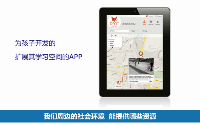 此外,我们必须去思考,我们的周边的社会环境里能提供哪些资源。为此我专门设计了一个APP程序——DYC(探索你的城市)。这个程序汇集了一个城市所有可供使用的社会资源,社区可以提供哪些服务,哪里有体育场地,哪里有图书馆,哪里有专门针对孩子的服务,比如游泳馆、足球场,并加以分门别类,通过一个App提供给每个孩子。每个孩子都可以检索查找这些地方,当孩子在某个场所做过游戏,做过某些活动,就可以对此场所进行评价。这是一种新途径,让幼儿园通过使用新技术把社会文化的周边环境积极地纳入幼儿园地工作和服务中去。