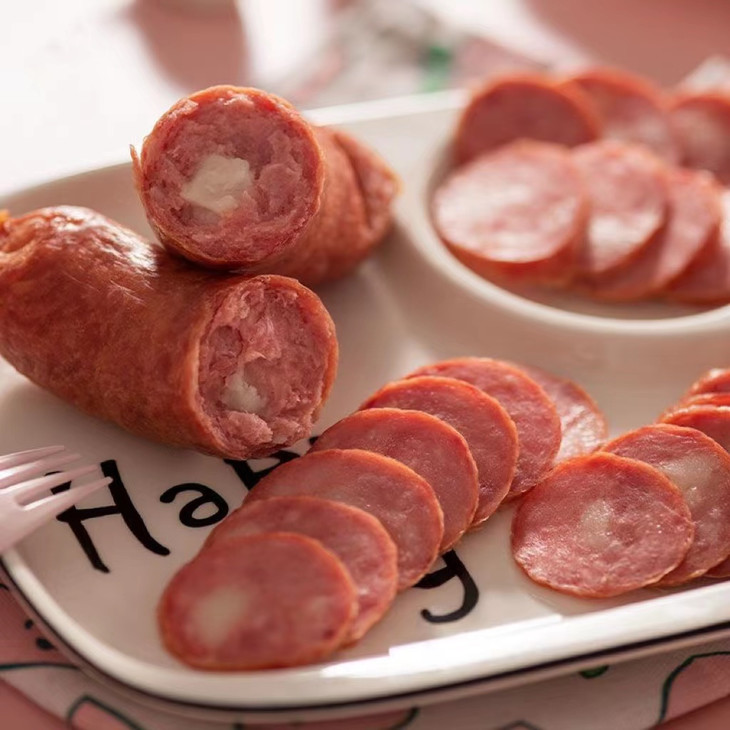 红肠是用猪肉、鸡肉、大蒜等材料加工制作的香肠