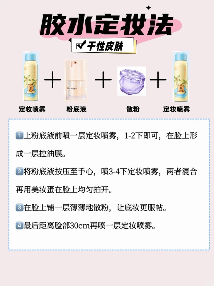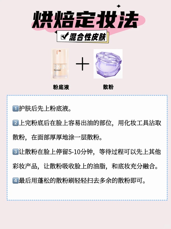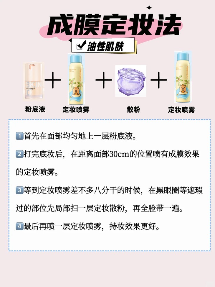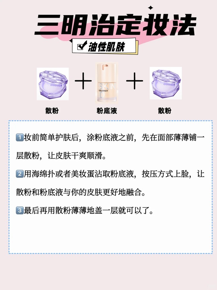 粉底液全脸拍匀→美妆蛋蘸大量散粉按压易出油区→静候3分钟扫掉余粉→喷定妆喷雾加固