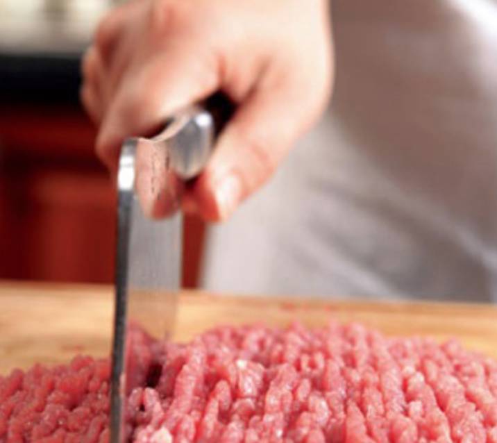 1、牛肉清洗干净,用刀背“啪啪啪”剁成肉绒,不建议直接绞肉机绞馅,会影响口感,再说了,这锻炼身体的机会怎么能白白错过呢:);