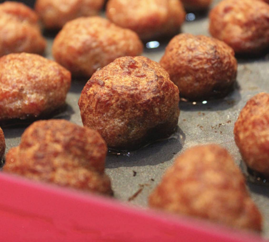 1、准备平底锅,锅烧热后,倒入一层底油,微微起烟后改成最小火,把丸子逐个摆进锅中;
