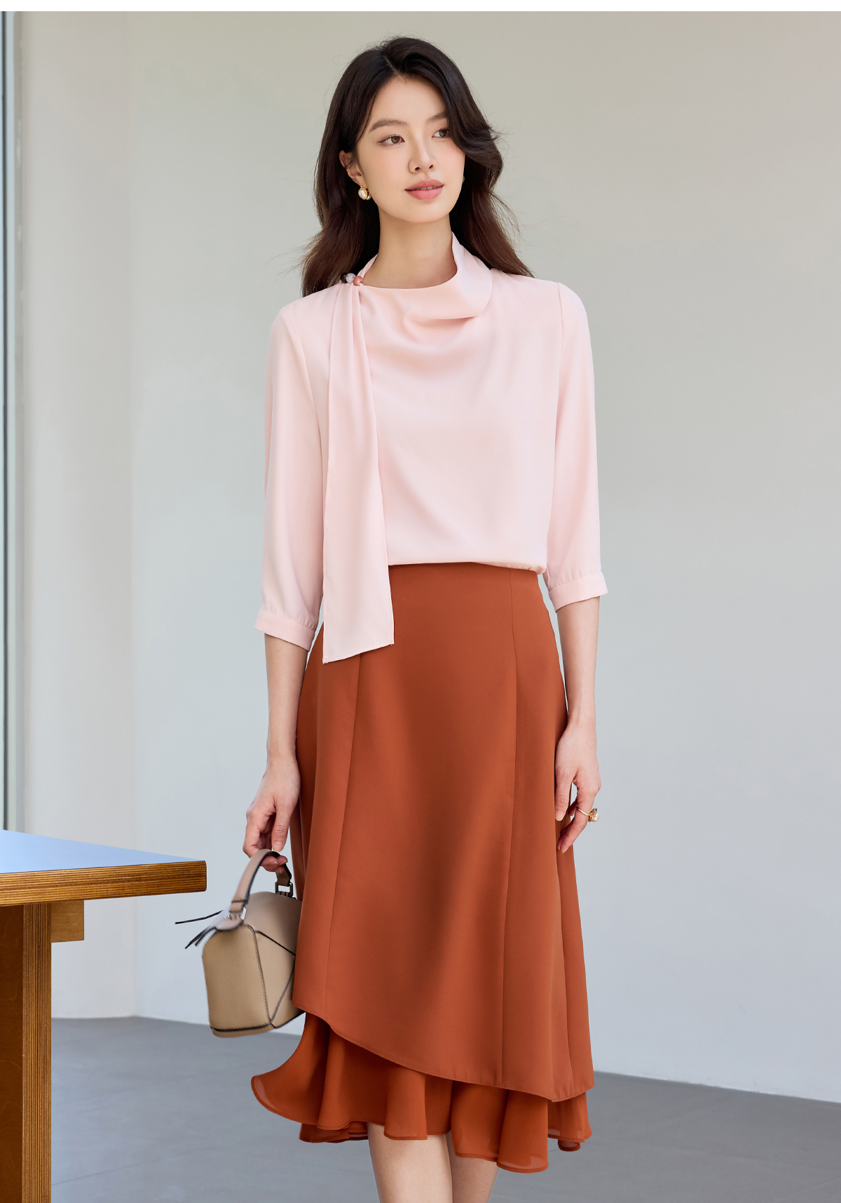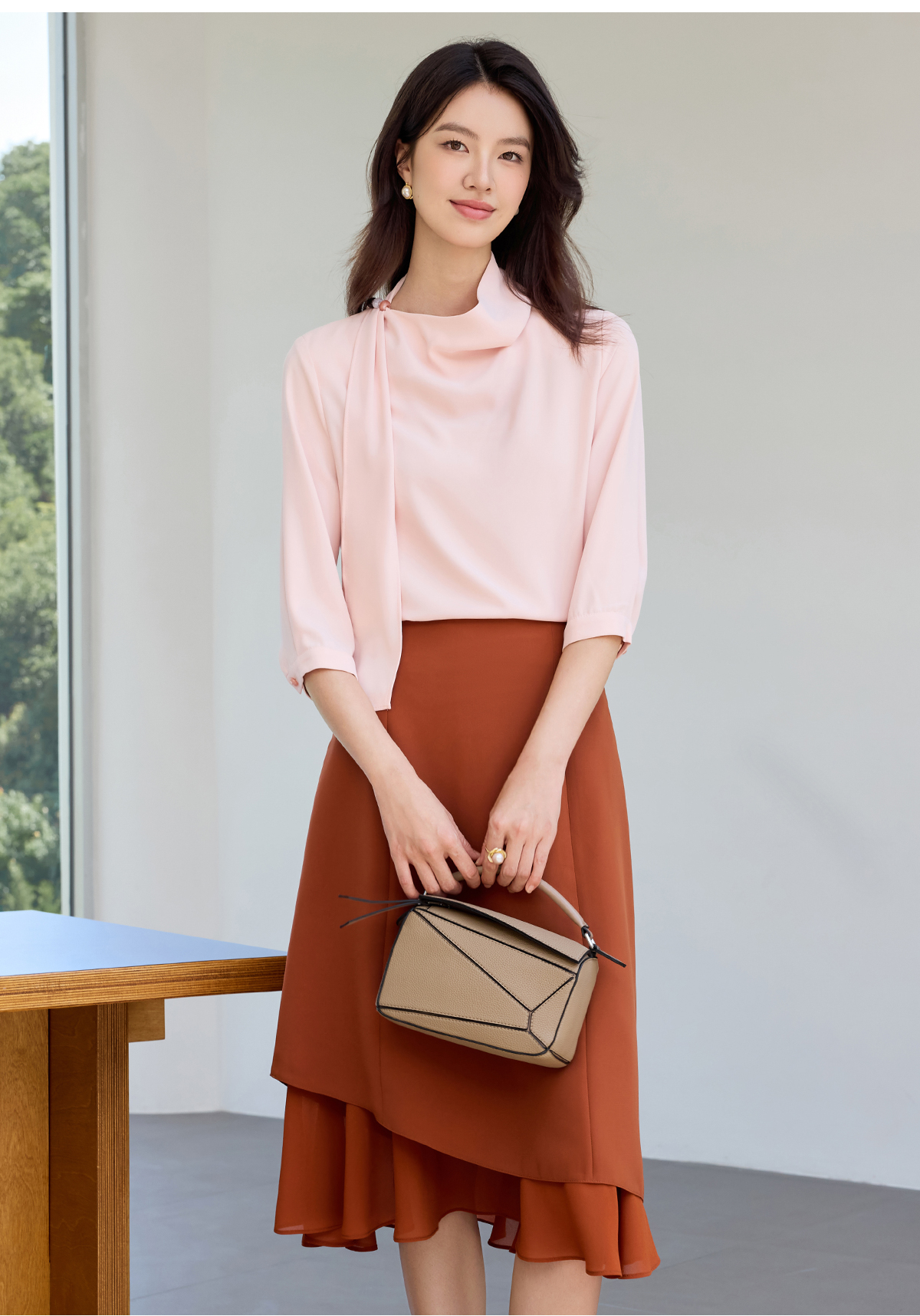 浅粉与焦糖的撞色,是春日里最温柔的配色公式。七分袖的柔滑上衣,带着恰到好处的松弛感,领口的飘带设计,藏着不刻意的精致小心思。