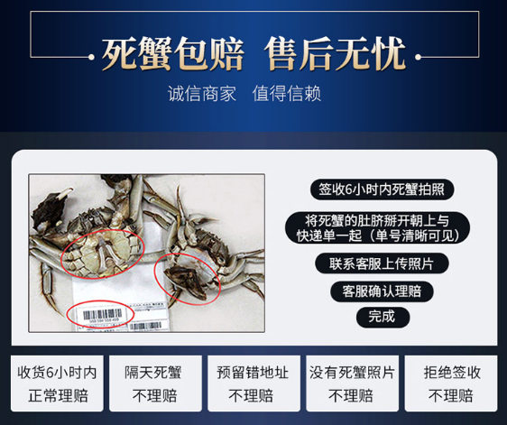 除此之外,我们售后有保障,如果您在收货六小时内发现死蟹,可以联系我们,我们会给您进行赔付。