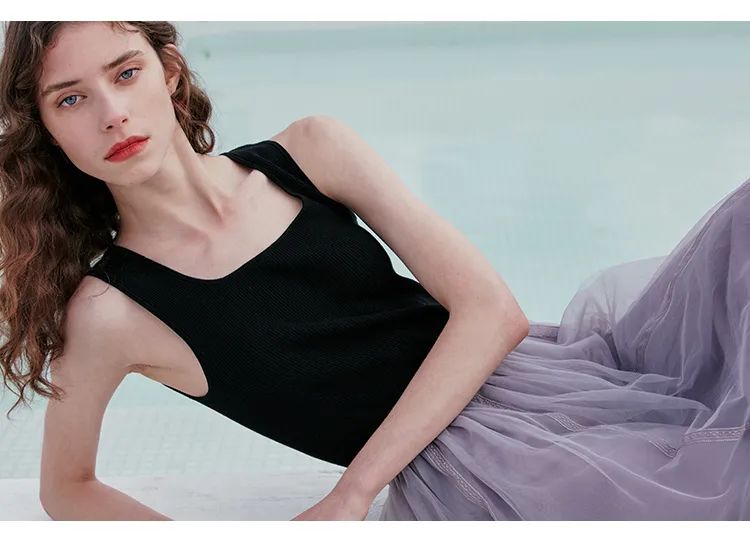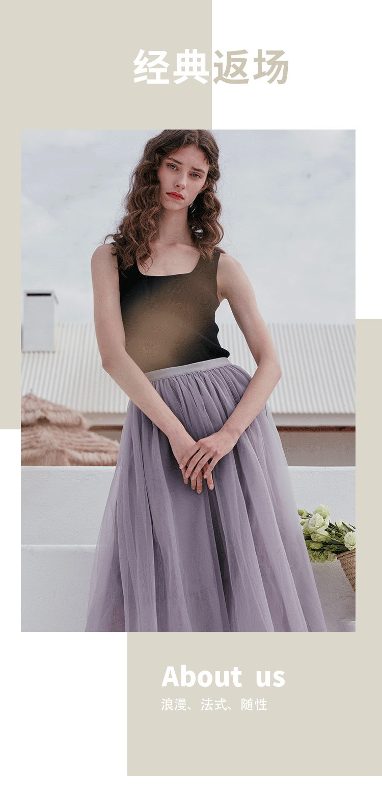 随性简约的工字背心恰好平衡纱裙的华丽感,