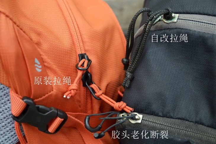 老款24L为塑料拉绳头,几年下来已经老化磨损;新款27L采用直接拉绳设计,个人认为更简洁与实用。