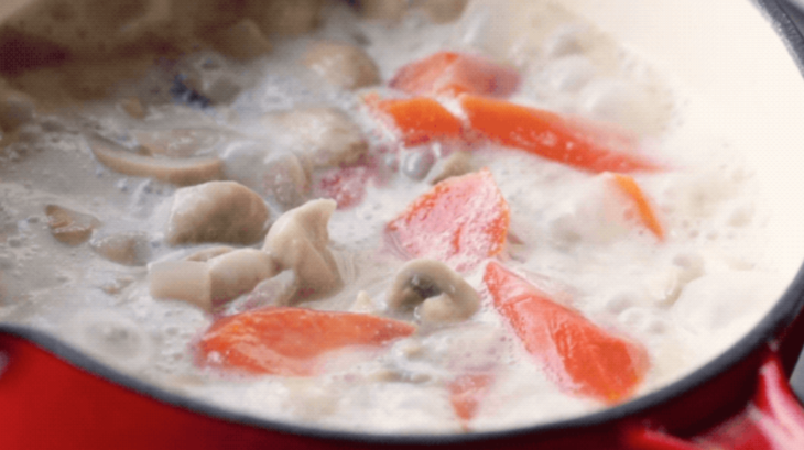 原料:格力高扁桃仁效果奶、鸡腿肉、蘑菇、洋葱、胡萝卜
