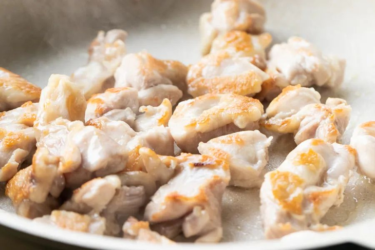 2.平底锅不用放油,直接鸡皮朝下放入鸡腿块,闷煎至鸡皮金黄色,盛出备用