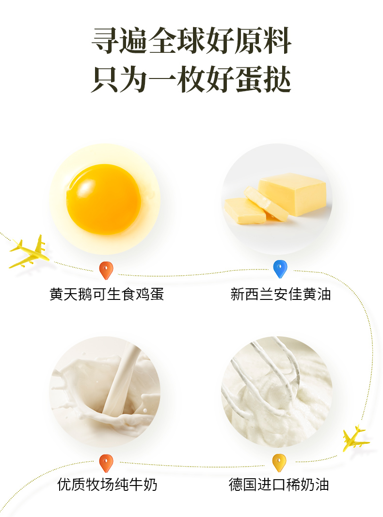 采用优质牧场纯牛奶+进口稀奶油以及可生食的黄天鹅鸡蛋