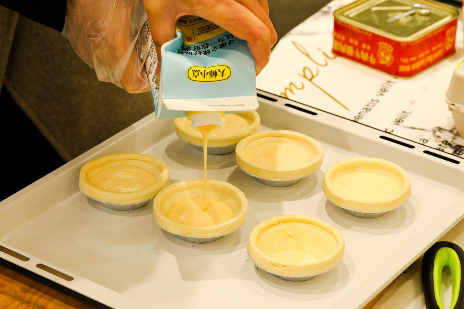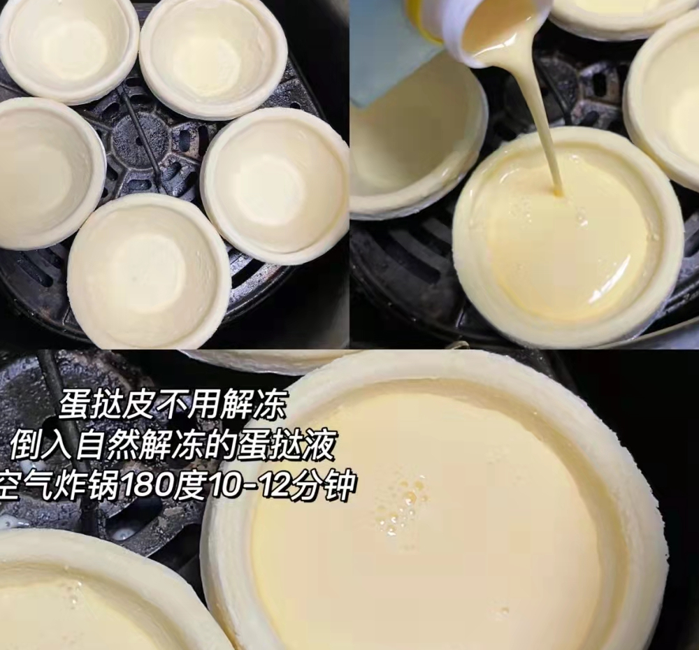 蛋挞皮加入充分解冻的蛋挞液至8分满