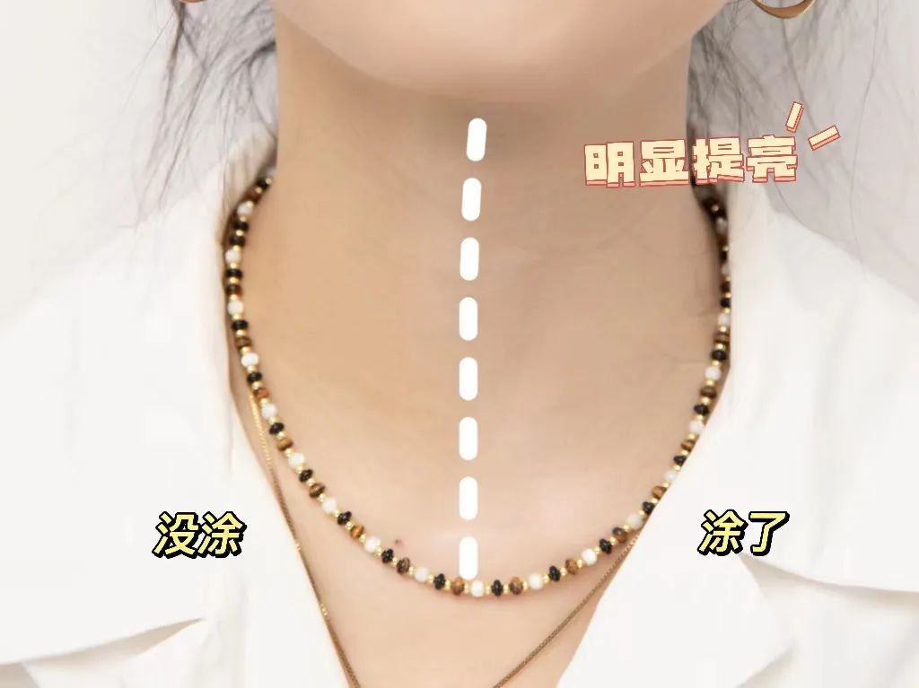 特意涂在脖子上做了个对比,肤色明显提亮但不会泛油假白,用来涂脖子防色差,或者做素颜霜都不错。👇