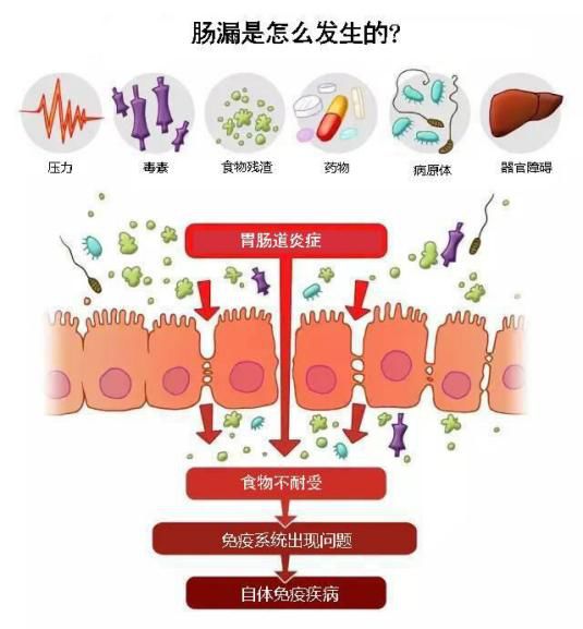 肠漏,顾名思义就是指因为某些因素导致肠道出现了漏洞,不再完整,因此肠道内未完全消化的蛋白质、毒素和微生物等成分会通过漏孔进入体内,引发炎症、免疫反应、和形形色色的疾病。