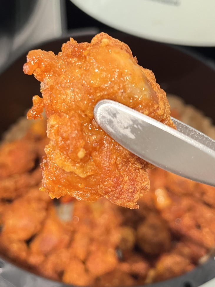 大概炸了9分钟左右,看起来已经很有食欲啦hhh,忍住口水,筷子扒拉扒拉,给它们翻个身,然后塞回去继续炸~