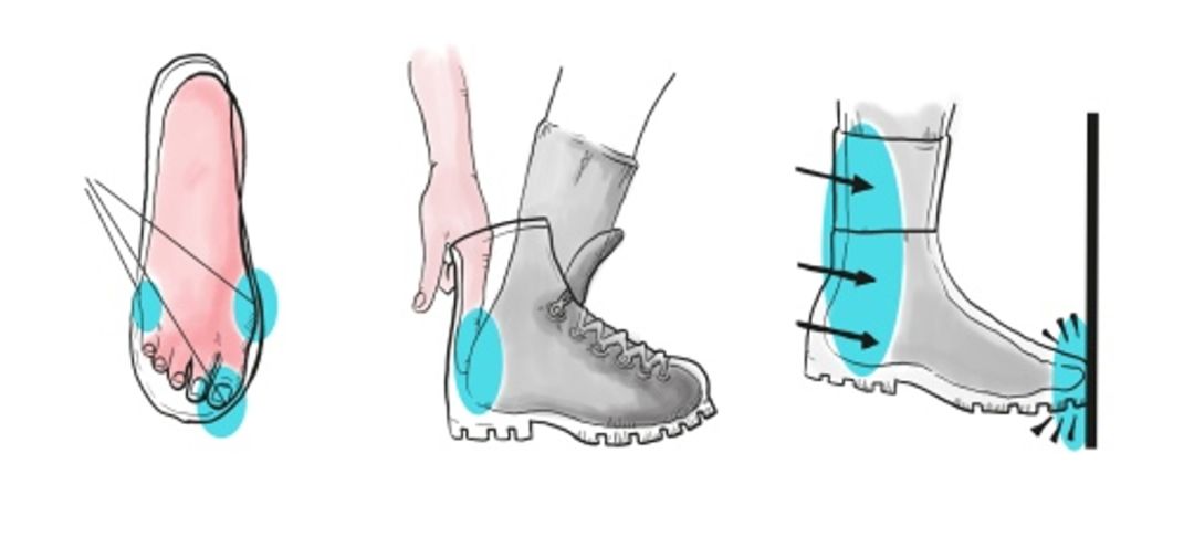 穿着鞋子试着走一走,感受一下脚弓、脚掌是否与鞋体充分吻合。脚尖不能顶住鞋头,保持脚趾可以略微抓动的空间,脚部跟鞋子的几个主要接触点是否舒适。