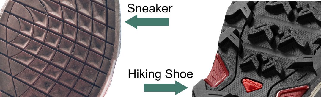 户外鞋的大底使用橡胶并混合添加剂以提高硬度,抓地力和耐磨性更好。