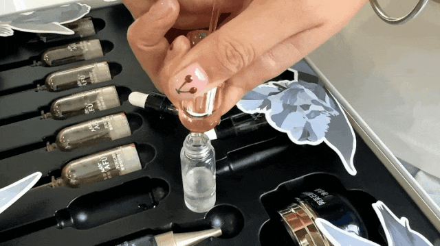 将精华液倒入精华油中盖上盖子,摇一摇就会变成乳白色。