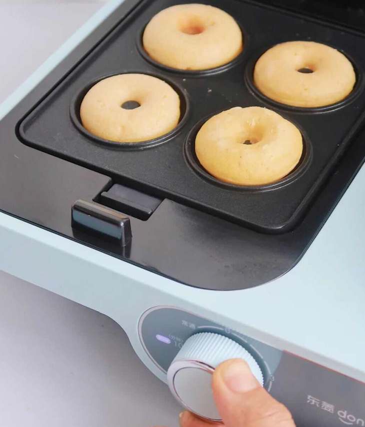 5、适量面糊倒入甜甜圈模具定时三分钟,翻面定时三分钟,鹰嘴豆用料理机打成泥,装入裱花袋,挤入甜甜圈,搭配圣女果、焯水的毛豆食用