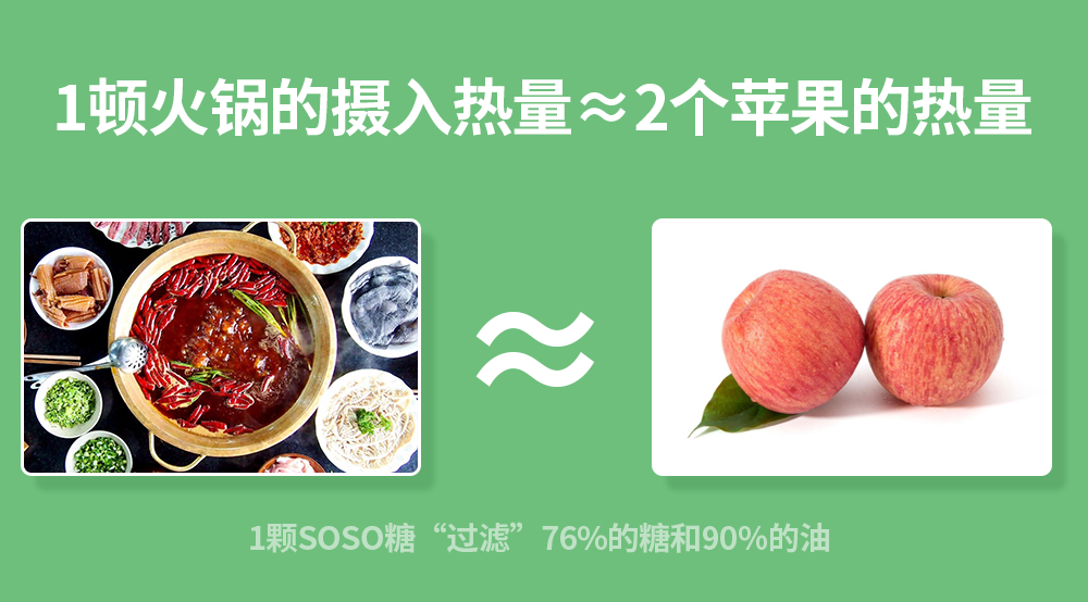 也就是吃了SOSO糖后吃火锅,1顿火锅的摄入热量≈2个苹果的热量。