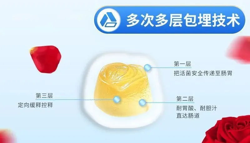 三层包裹能避免胃酸、胆汁等侵蚀,将益生菌安全输送到肠道;