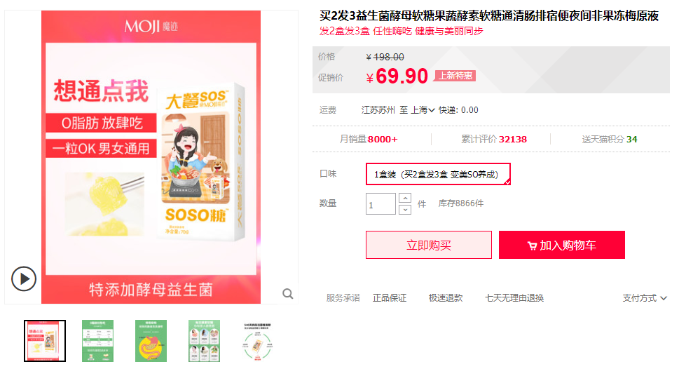 魔迹SOSO糖天猫官方旗舰店,一盒售价69.9元,而我们为了回馈粉丝,经过一个月的努力,拿到最低价,现在四盒仅需99元;