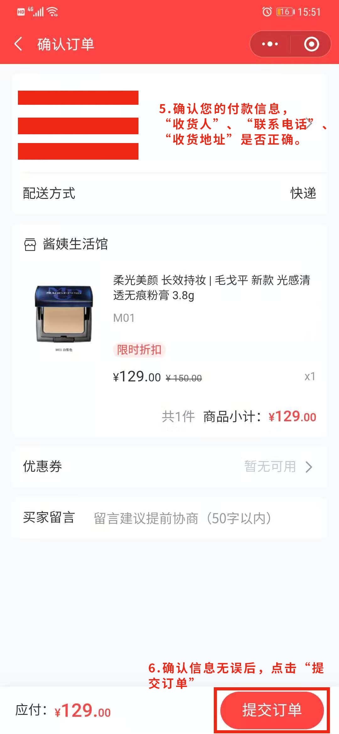 6.确定您的付款信息是否正确然后点击“提交订单”