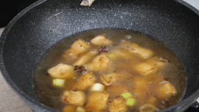 依次加入少许酱油,没过食材的清水和沥干油分的香料、4~5克干辣椒、5~6粒冰糖、3勺料酒、1~2克田陌上红曲米、3~4克盐、鲜黄酱。