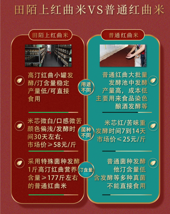 无论是从发酵工艺、发酵时间,古田高汀红曲米都更花费更多精力,高成本和漫长的等待,只为了制作出发酵营养更均衡的红曲米!