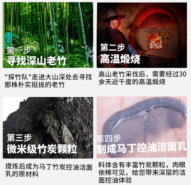“探竹队”走进大山深处去寻找到的一株株朴实挺拔的老竹。这些高山老竹采伐后,需要经过30余天近千度的高温煅烧,才能提炼成为竹炭控油洁面乳的原材料