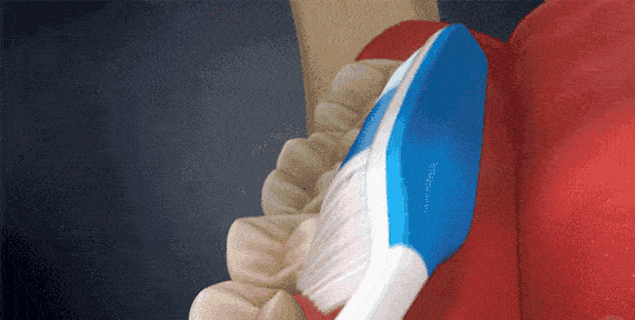 3/ 将此段牙线轻轻通过两牙之间,将牙线紧贴一侧牙面,并呈C形包围牙面;