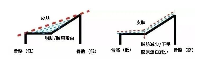 高度差形成坑坑洼洼的地方,年轻时会被胶原蛋白、脂肪“厚脸皮”等组织支撑,所以看上去饱满又平滑。但随着胶原蛋白逐渐减少,等到了某个年纪,皮肤渐渐失去支撑,皱纹就来“报道”啦~