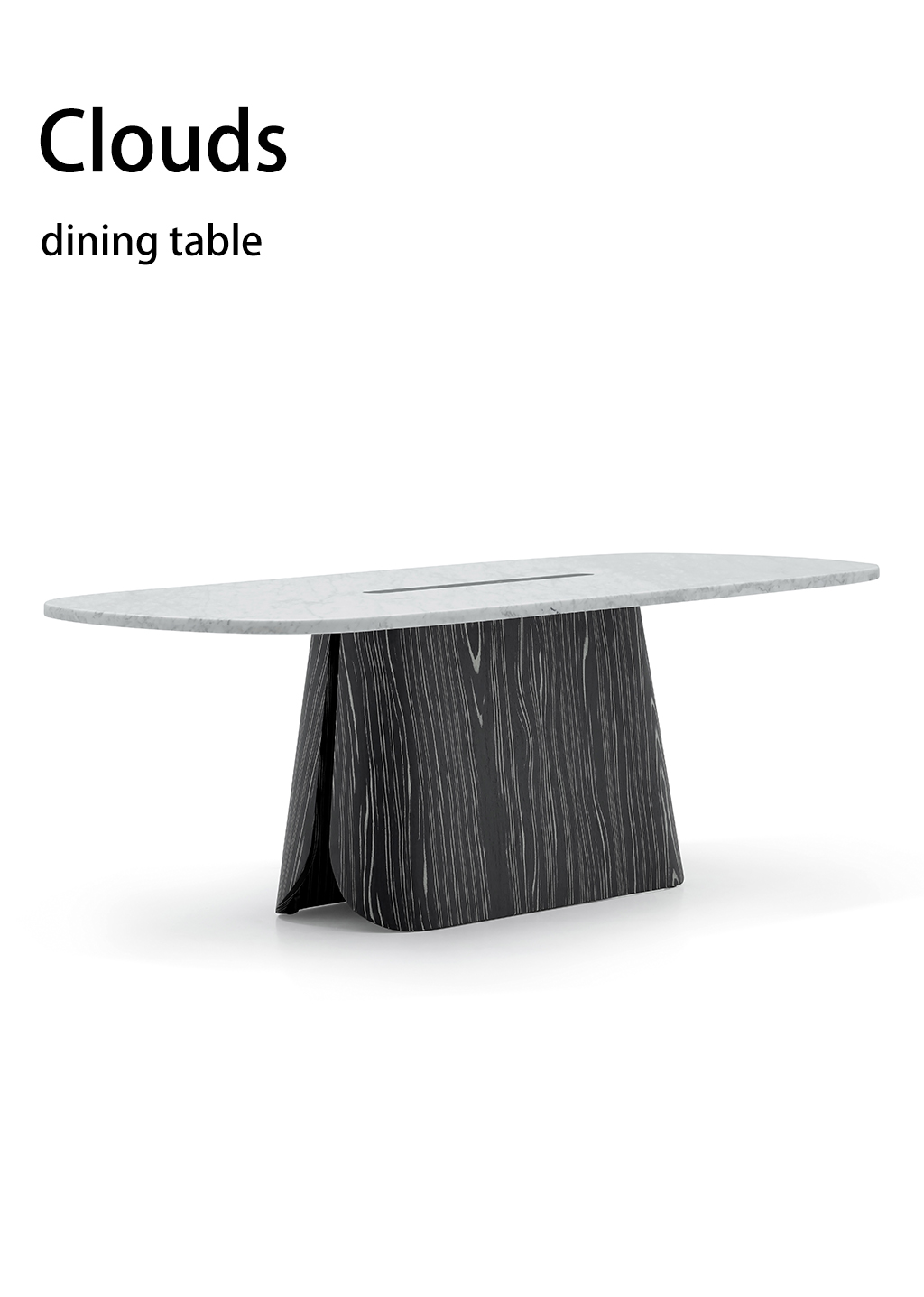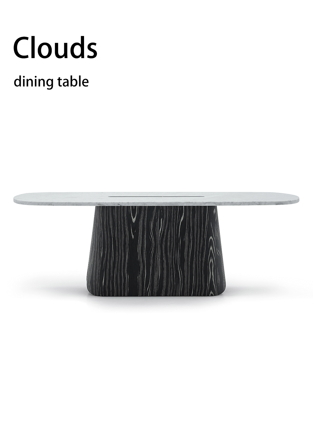 CLOUDS流云餐桌灵巧如云,在设计中融入东方美学意境。桌面采用卡拉拉白大理石,巧妙地以劳伦黑金大理石内嵌点缀,经典的黑白对比典雅大气。底座采用黑白檀木皮,纹理自然延伸,如云卷云舒,交织出优美韵律,散发温润内敛气质。
