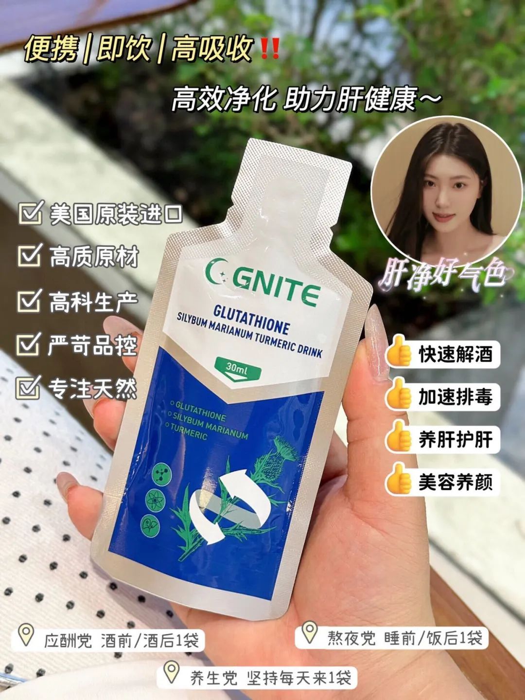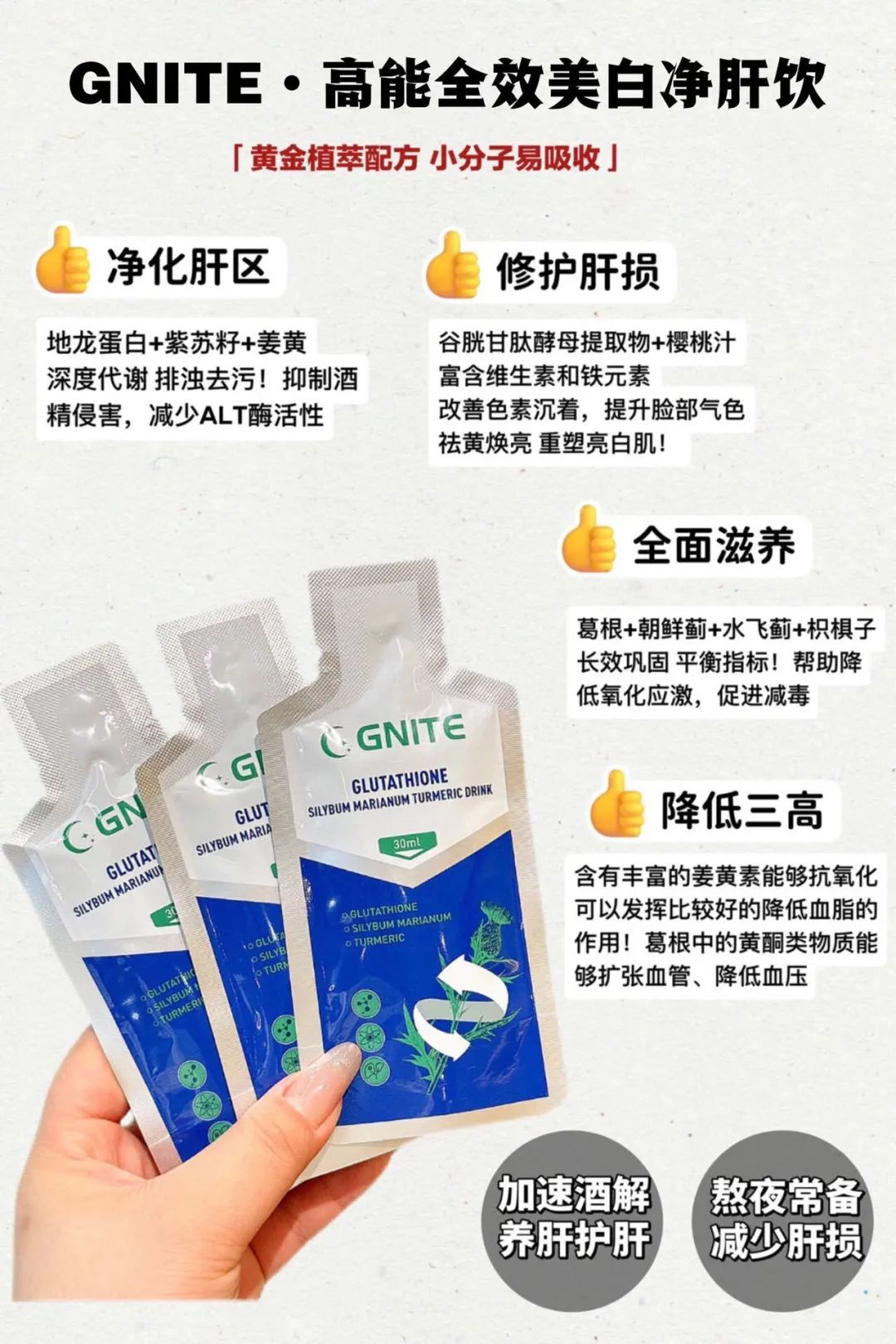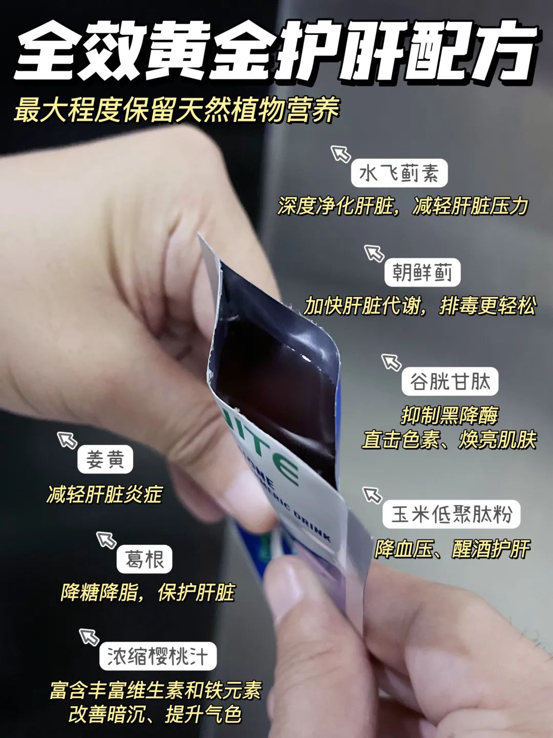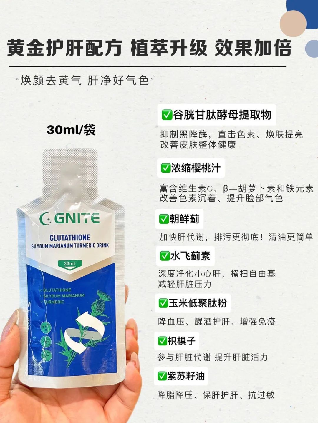 谷胱甘肽➕水飞蓟➕朝鲜蓟➕姜黄➕葛根➕浓缩樱桃汁等多重草本精华~
