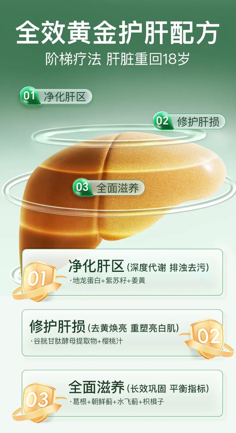 「姜黄 + 水飞蓟 + 朝鲜蓟 」 护肝届扛把子成分,深度净化肝脏、横扫自由基、减轻肝脏炎症!