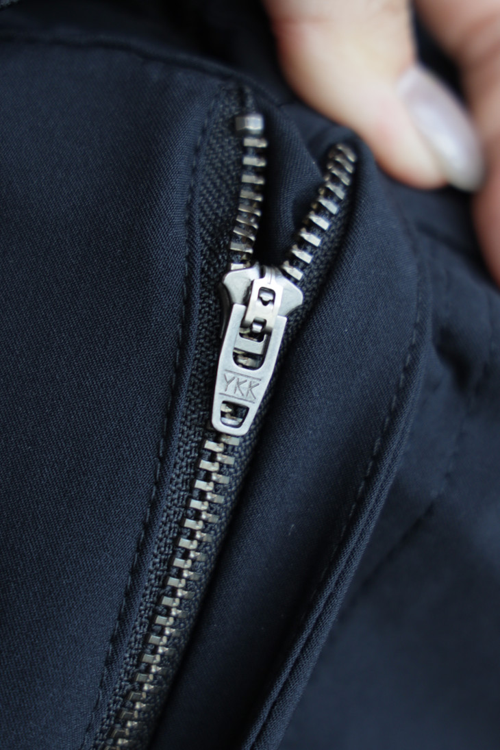 黄铜YKK拉链,顺滑耐用,精密车工走线,针脚匀称细密,确保版型挺括持久耐穿度升级。