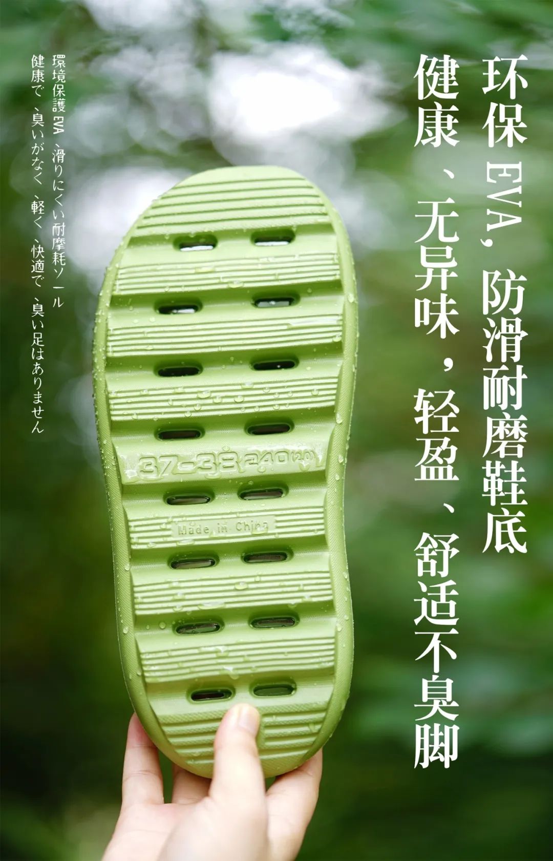 1、环保EVA材质:健康、无异味,轻盈、舒适不臭脚,