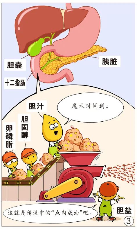 它能与甘氨酸或牛磺酸结合形成胆盐,并像洗洁精一样,将脂肪乳化成脂肪微滴,后续胰酶将脂肪微滴水解,胆汁酸又进一步将脂肪的水解产物变成脂肪微粒,微粒比微滴更小,从而帮助脂肪和脂溶性维生素在消化道中被吸收。