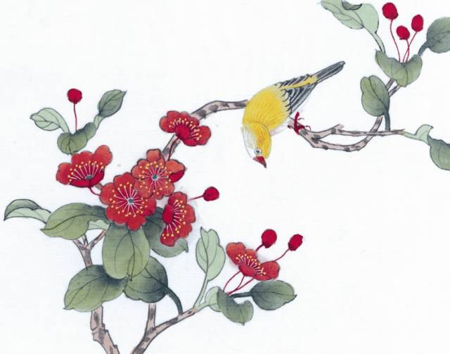 虽然花鸟画不像山水画常有移动视点的表现法,通常视角比较稳定,但我们观察时可运用移动视点的方法,选取最美 角度写生,并注意花、枝、叶的大小比例。