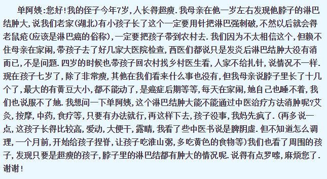 单阿姨:您好!我的侄子今年7岁,人长得超瘦.我母亲在他一岁左右发现他脖子的淋巴结肿大,说我们老家(湖北)有小孩子长了这个一定要用针把淋巴强刺破,不然以后就会得老鼠疮(应该是淋巴癌的俗称),一定要把孩子带到农村去.我们因为不太相信这个,但赖不住母亲在家闹,带孩子去了好几家大医院检查,西医们都说只是发炎后淋巴结肿大没有消而已,不是问题.四岁的时候也带孩子回农村找乡村医生看,人家不给扎针,说情况不一样.现在孩子七岁了,除了非常瘦,其他在我们看来什么事也没有,但我母亲说脖子里长了十几个了,最大的有黄豆大小,都不能动了,是癌症后期等等,每天在家闹,她自己也睡不着,我们也说服不了她.我想问一下单阿姨,这个淋巴结肿大能不能通过中医调理方法消肿呢?艾灸,按摩,中药,食疗等,只要有办法就行,再这样下去,孩子没事,我妈先疯了.(再多说一点,这孩子长得比较高,爱动,大便干,露睛,我看了些中医书说是脾阴虚.但不知道怎么调理,一个月前,开始给孩子捏脊,让孩子吃淮山粥,多吃黄色的食物等)我们也看了周围的孩子,发现只要是超瘦的孩子,脖子里的淋巴结都有肿大的情况呢.说得有点罗嗦,麻烦您了.谢谢!