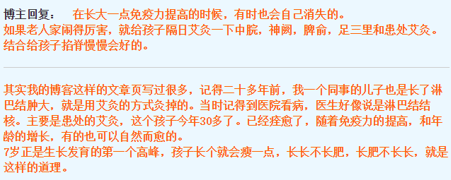 其实我的博客这样的文章页写过很多,记得二十多年前,我一个同事的儿子也是长了淋巴结肿大,就是用艾灸的方式灸掉的。当时记得到医院看病,医生好像说是淋巴结结核。主要是患处的艾灸,这个孩子今年30多了。已经痊愈了,随着免疫力的提高,和年龄的增长,有的也可以自然而愈的。