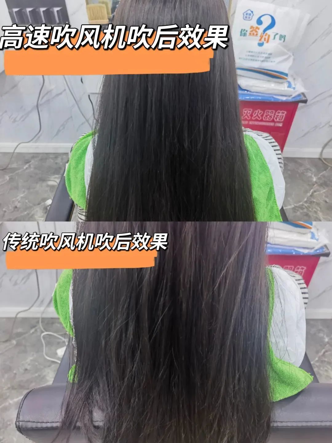 将刚刚洗过的头发分成两部分,用普通速干吹风机和大宇吹风机吹干。